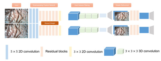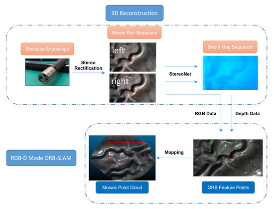 MIS has made great progress in the past decade. With the development of stereovision technology, 3D endoscopy has been increasingly used due to its rich depth of information [1]. How to accurately reconstruct 3D information and splice the obtained point cloud with the help of endoscopy has also become a research hotspot. This study was started from previous research on monocular endoscopy and binocular endoscopy, which are widely used methods at present. Image depth estimation is the basic module of SLAM. Widya et al. used Shape from Motion (SfM) to achieve complete stomach reconstruction based on monocular endoscopy, but the reconstruction results were sparse and lacked physical scale information [2]. With the development of deep learning, monocular depth prediction has gradually become the focus of research [3]. Li and Liu et al. realized the super resolution of the predicted depth map by using the color image super resolution model, which greatly affected the accuracy [4,5]. In order to obtain a more accurate depth map, a deeper deep learning network was built to achieve a more accurate depth estimation, but it is greatly affected in terms of efficiency [6,7,8]. Binocular endoscopy benefits from the existence of disparity information. Depth information is easier to obtain under light sources such as white light, xenon lamps, and lasers [9,10]. The SGBM algorithm proposed by Hirschmuller et al. has been widely used in traditional binocular scenes due to its advantages of fast speed and high precision [11]. Xia et al. improved the SGBM algorithm to improve its accuracy of reconstruction in the contexts of sparse textures and a large number of pathological regions in the endoscope scene [12]. With the development of neural networks, three-dimensional matching technology based on deep learning has been applied more widely. However, there is no publicly available binocular dataset in the field of MIS. To overcome this problem, researchers have adopted traditional scene datasets [13], self-supervised convolutional neural networks [14], and simulation models rendered using Blender [15,16], etc., but the results differ from those of traditional scenes.