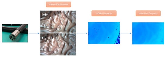 Since there is no public clinical or rendering dataset of binocular endoscopy, we propose a fast and simple method for binocular endoscopy image datasets under the gastrointestinal tract, which can generate many datasets in a short time for the training of deep learning neural networks. The production flow is shown in Figure 2, where the SGBM algorithm, which is widely used for binocular image reconstruction, is first applied to obtain the initial disparity map. However, due to the ill-conditioned areas such as over-exposure, occlusion, and noise in the gastroscopy images, the robustness of the algorithm is poor and many disparity holes and some mismatching occur. Aiming at the hole in the process of ill-conditioned region matching, we propose a hole-filling algorithm, which takes advantage of the characteristic that the surface depth of most organs in the scene we photographed often vary continuously. Therefore, the corresponding disparity value is also continuously changed, and iterative mean filtering is performed on the hole’s boundary points to replace the original error value by the average of the effective values in the neighborhood of the hole boundary pixels, thus filling the hole. In the hole detection step, the Canny detection operator is used to detect and extract the initial disparity map edge, and it is filled with morphology information. The pixels on the hole boundary of the first detected edge region are processed by mean filtering, and the disparity map is updated. Then the process is repeated until the holes in the disparity map cannot be detected by the Canny edge detection. Median filtering is performed on all pixels in the disparity map that are below the set threshold to remove the residual noise and complete the process of filling the holes.
