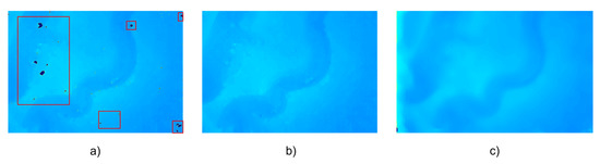 A binocular endoscope was used to acquire left and right images, SGBM and SGBM with hole-filling and StereoNet prediction, respectively, were adopted to process the acquired images and obtain the depth map of a single image. The results are shown in Figure 4. There are many holes in the depth map obtained by the traditional SGBM method, as shown in the red rectangles in Figure 4a. After hole-filling, the results obtained by the SGBM algorithm are smoother and the noise is reduced. The results predicted by StereoNet will not only fill the holes in the traditional algorithm, but the resulting image will also be smoother, in line with the characteristics of the continuous depth of human organs.