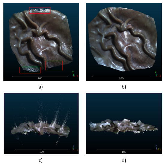 Since the hole-filling method takes too long to reconstruct a single frame, only the images obtained by the traditional SGBM algorithm StereoNet are used for mosaicking when using ORB-SLAM. After the multiple depth map sequences are obtained by SGBM and StereoNet and the image sequences taken by the left camera are used as the input of ORB-SLAM in RGB-D mode, a wide-range mosaicked point cloud image is obtained as shown in Figure 5. In Figure 5, the point cloud images obtained by the two methods are compared from the top view and side view. It can be seen that after converting the depth maps into point cloud images, there are a large number of outliers in the depth maps obtained by the traditional SGBM methods in Figure 5a,c. Moreover, unfilled holes are shown in the red rectangles in Figure 5a and the shortcoming of not being smooth enough affect the final stitching results. In Figure 5b,d, compared with the result by traditional SGBM algorithm, the depth map predicted by StereoNet not only realized the filling of holes, but also had fewer noise points. In the mosaicked point cloud map, there were fewer outliers in the whole pig stomach. The smooth result of StereoNet’s prediction could be observed from different perspectives, and the reconstructed whole pig stomach was closer to the ground truth.