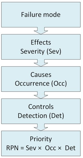 The three indices, ranging from 1 to 10 each, are then combined together in one quantity called the risk priority number (RPN), which reflects the priority of the identified failure modes []. The RPN is calculated by multiplying the three indices as given in the following: