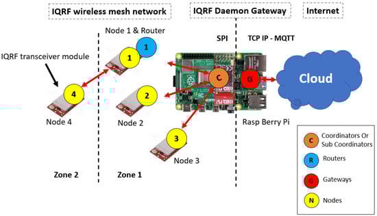 The past few years have seen a widespread diffusion of novel LPWAN technologies. Some LPWAN products, such as LoRa, Sigfox, On-Ramp Wireless, Weightless, and many others [,], have been gaining momentum and commercial interest as enabling technologies for the IoT. Alternatively, some other emerging technologies of LPWAN are gaining maturity and waiting to be investigated. Intelligent connectivity using radio frequency (IQRF) is one of these technologies [,]. IQRF is a recently developed IoT platform for wireless connectivity operating in sub-GHz ISM bands. It provides a full mesh network, terminating into gateways which in turn upload data to the cloud through LTE, GSM, or Wi-Fi protocols. This technology could be considered not only as a low-power metropolitan area network (LPMAN), but also as a LPWAN, since it offers cost-effective solutions for medium/long range IoT applications that extend from a few to tens of kilometers [,,].
