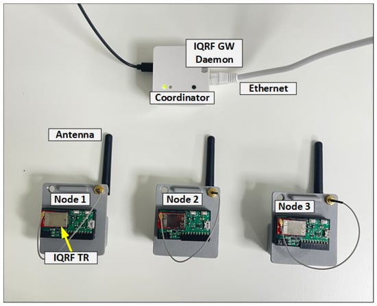 The experiment setup. Three IQRF nodes, one coordinator node, and one gateway.