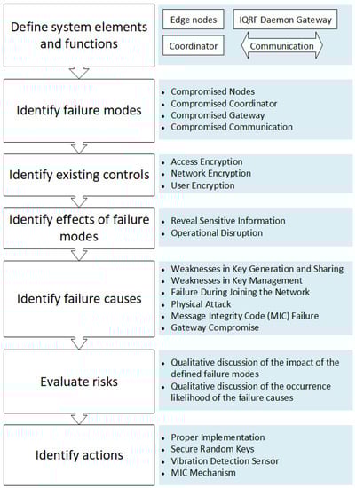 In this section, the method and the findings of the conducted security analysis for the IQRF technology are presented. It is worth mentioning that the cloud system security analysis is not part of this study. Only the cyber risks of IQRF WSN, the communications between the nodes, and a part of the gateway are analyzed. The analysis process is depicted in Figure 4, with brief details about the followed steps in this work. Notably, FMEA focuses on failures in a system during the cybersecurity analysis, and attacks are the general term of undesired behavior (i.e., failures). In this paper, the terms failures and attacks are used interchangeably.