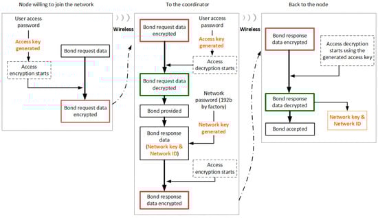 During the joining process, all sensitive data, such as networking passwords described in Section 4.3.2, the network identification (NID), and the node address of the node willing to join the network, are transferred encrypted. At this level, AES-128 with a 16 B long key and the standard electronic codebook (ECB) mode of operation are used for encryption []. The joining process of a node to an IQRF network is simplified in Figure 6.
