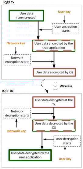 In addition to data encryption, by using an access key and an networking key in an IQRF network, the user can also contribute to increasing the data privacy and security by adding another encryption shield in order to hide the user’s payload for both networking (using IQMESH) and non-networking (peer-to-peer) schemes [,]. Accordingly, user encryption is fully handled and controlled by the user in the user application code. Hence, a 16 B user key needs to be specified at the transceiver (node) configuration phase or in the user application code by first placing the desired 16 B user key at a buffer called bufferINFO, and then setting the user key using the embedded OS function named setUserKey(). Once the key is set, the OS encryption function, named encryptBufferRF(blocks), needs to be called. On the other hand, at the receiving node, a decryption OS function, named decryptBufferRF(blocks), must to be called for decryption. This function replaces the ciphertext in the bufferRF by the plaintext decrypted by the current user key. The ciphertext must be a multiple of 16 B (16 B, 32 B, 48 B, or 64 B). In addition, the same key must be used for encryption and decryption. Figure 7 also shows the user data encryption.