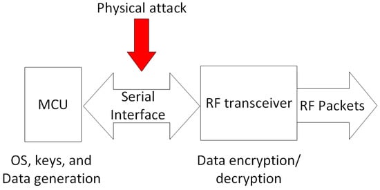 In many cases, IoT devices are used in remote locations. In fact, those networks are exposed to physical attacks ranging from tempering through to theft. Therefore, an IQRF node can be compromised in a number of ways. For instance, from an IQRF transceiver’s basic architecture, shown in Figure 8, and the explored technical documents of the used components and circuits, it is observed that the MCU communicates with the RF circuit using serial communication interfaces such as SPI or UART. All data, such as the generated networking and access keys by the OS and the NID in the case of the coordinator node, are exchanged via the serial interface un-encrypted to the RF circuit. This is due to the fact that all generated data from the MCU are encrypted/decrypted at the RF circuit where the AES 128-bit encryption co-processor is located. Thereupon, an attacker with physical access to one of the network end nodes (IQRF TRs) could in theory packet sniff using signals recorded on the serial interface of the IQRF transceiver. Therefore, the access and the networking keys and all the sensitive information could be recorded.
