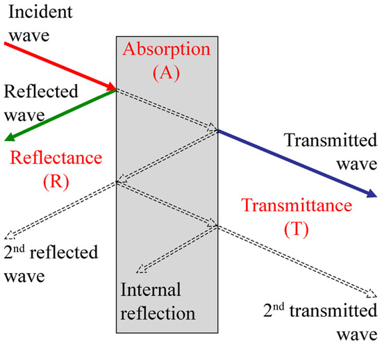 Hence, these EMWs have different energies based on their frequencies. Classically, the EMWs are divided into different spectrums based on their energies. The waves at the lower end of the spectrum have lower frequencies, i.e., lower energies and so on [2]. When a EMW falls on a material, there can be three types of effects: absorption, reflection or transmission (through the material) as shown in Figure 1. When the incident wave intensity is reduced upon transmission, it is called shielding [2]. Therefore, the total SE is represented as Equation (3), where SEA is due to the absorption, SER is due to the reflection and SEM is due to multiple reflections: