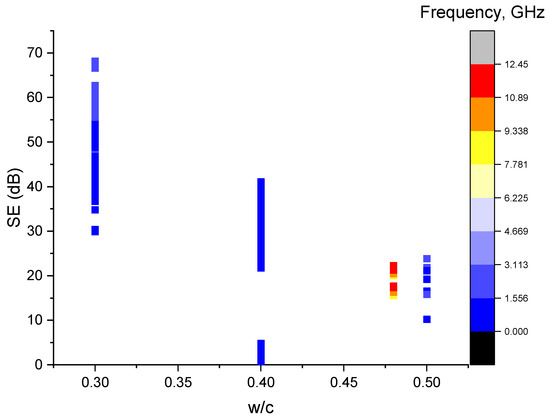 - The scatter plot for the SE against the water-to-cement ratio illustrated that a higher w/c ratio led to a poorer SE, since a higher water content increased the porosity of the material and, hence, increasing the multiple reflection of the EMW and the inclusion of the fibres aids this deterioration. This observation is consistent with the conclusions drawn in the previous literature.