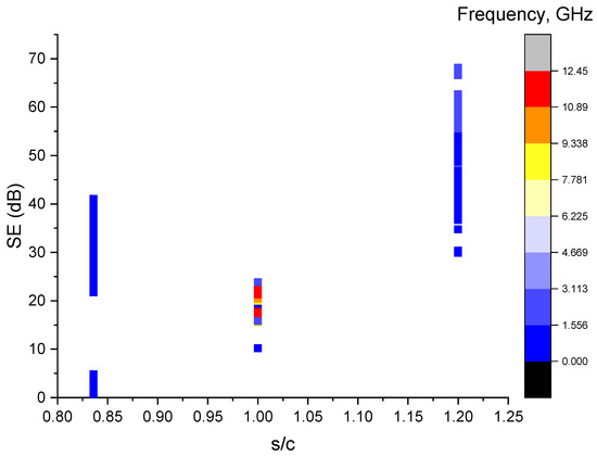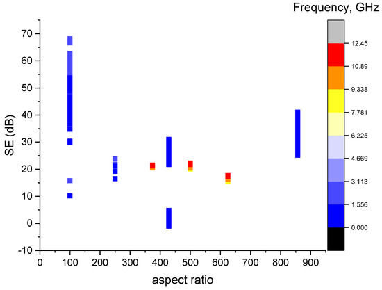 From Figure 6, it can be seen that with a higher frequency, the SE is higher. Within a frequency band of 0–6.225 GHz, the increase in the aspect ratio tends to decrease the SE and then slightly increase.