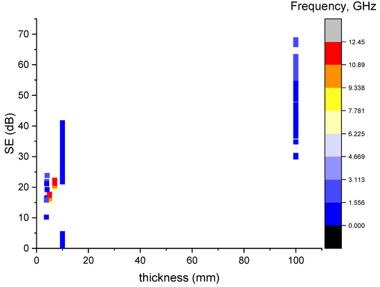 According to Figure 5, it has been witnessed that the data are mainly located at the thickness of approximately 10 mm and 100 mm and showed a big blank in between. It is mainly attributed to the differences between the testing standards and most of the data gathered used a similar specimen geometry. It should be noted that it is brutal to conclude that increasing the specimen thickness had a higher overall SE due to a lack in the variation in the data for the specimen thickness. However, the thickness of the material also plays a significant role in generating a high EMI shielding effectiveness in a material [23]. This therefore reflects and indicates the possibility of further research into considering size effect on the SE.