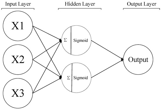 A backpropagation neuron network model (BPNN) is one type of an artificial neuron networks (ANN), which assesses the differences between the predictions and labels, then propagates the errors to each neuron to adjust the weightings and biases to achieve the expected training goal. BPNN models or neural network-based models have been deeply studied and widely applied in predicting or estimating fresh or hardened properties of concrete or cementitious composites [30,31,32,33]. A simple BPNN model consists of three layers: an input layer, numerous hidden layers and an output layer, as shown in Figure 7. The connections between the neurons in the different layers can be expressed as