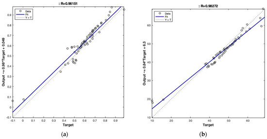 In this study, the model’s performance was assessed based on two parameters, namely the root mean square error (RMSE) and the coefficient correlation (R), which describe the degree of the correlation of the input parameters to the SE. The proposed BPNN can be mathematically described as Equation (7). Due to the heavy computation, we attempted to minimise the computation required by mapping the inputs from 0 to 1 according to the following equations. It should also be noted that the output of the model was mapped back for a result discussion, as shown in Equations (8)–(10). The developed BPNN model offered an R and RMSES of 0.962 and 0.31 dB for the training set. For the test set, the model reached an R and RMSE of 0.983 and 2.64 dB, respectively, as shown in Figure 8. These indicate that the proposed BPNN model has the ability to estimate the SE at a given frequency using mixed design parameters at a relatively good level.