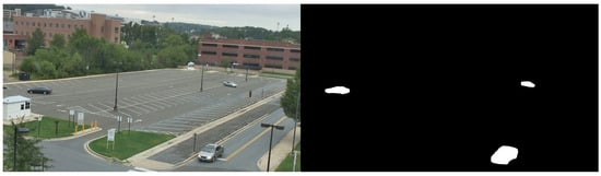 Segmentation result of cars, which is suited for use as an SDR. Original frame taken from VIRAT [28].