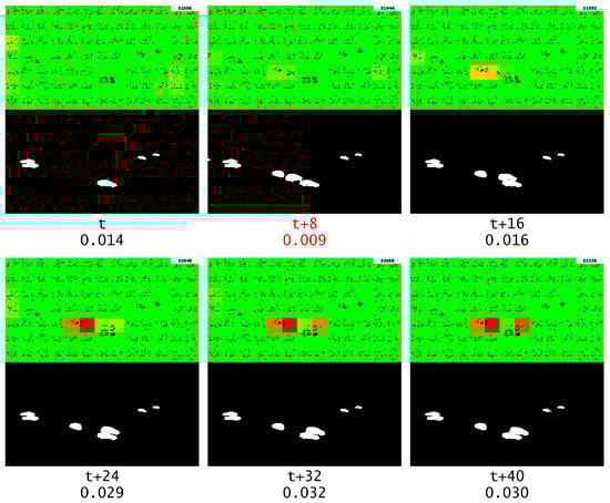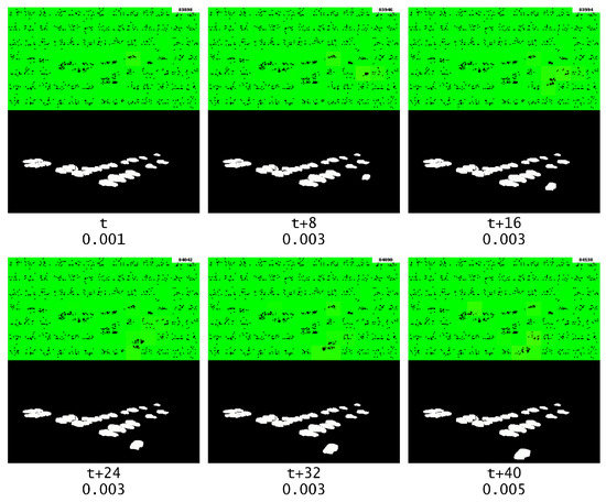 As shown in Figure 15, it can be observed that the anomaly output is much lower when there is no repeating frame. This confirms that the anomaly was caused by the repeated frame, and that GridHTM was able to learn the expected temporal patterns of moving objects.