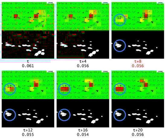 Anomaly output during the repeating frame, the start of the frame repeat is marked with red text. The blue circle highlights the object of interest. This time without multistep temporal patterns.