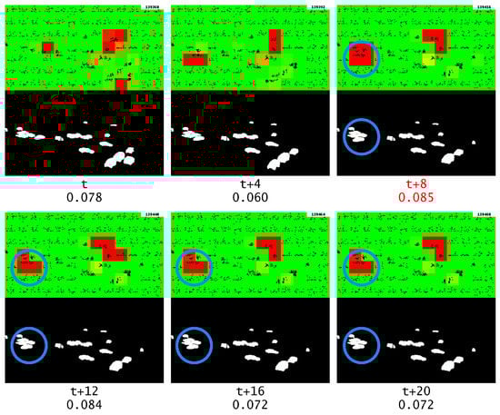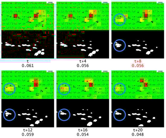 The first segment anomaly, which is marked with red text, and the corresponding changes detected by GridHTM (from red to yellow, strong to light weak change and green no change). The numbers beneath each frame represent the relative frame number and the current anomaly score, respectively.