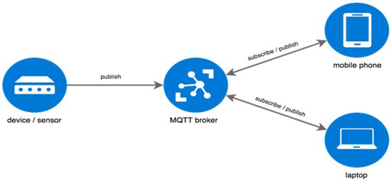 On the other hand, the Message Queue Telemetry Transport (MQTT) protocol has been widely deployed as an application layer messaging and information exchange protocol in machine-to-machine (M2M) communication [25]. This is due to its ability to function with resource-constrained devices that utilize low bandwidth and unreliable links. MQTT is considered a lightweight, energy-efficient, and bandwidth-efficient communication protocol. MQTT utilizes the publish/subscribe architecture model to provide transition flexibility and simplicity of implementation. MQTT’s main components are the publishers (lightweight sensors), the subscribers (applications interested in sensor data), and the brokers (connect publishers and subscribers and classify sensor data into topics) as illustrated in Figure 1. The data generated by a publisher are dispatched to multiple subscribers through an MQTT broker. MQTT was proposed in 1999 by Andy Stanford-Clark of IBM and Arlen Nipper of Arcom and is currently an OASIS (Organization for the Advancement of Structured Information Standards) standard; it also has a standard defined in ISO/IEC 20922: 2016.