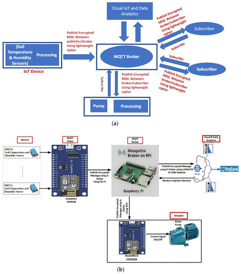The sensing layer is made up of multiple low-power sensors that are spread on agricultural land to continuously collect soil temperature and humidity. The DHT11 sensors are used to measure the temperature value in degrees Celsius and the humidity value in percentage. The DHT-11 sensor has three pins: two of which are for power and one is for output data transmission. The three pins are used to connect the DHT11 sensor to the NodeMCU ESP8266 board. The DHT-11 library must be added to the Arduino IDE software before uploading to the NodeMCU ESP8266 board the code written to read the humidity and temperature value from the DHT11 sensor. Together, the DHT-11 sensor and the NodeMCU form the IoT node. The NodeMCU runs the MQTT client code and publishes the sensed soil parameters (the temperature and humidity readings) to the MQTT broker after encrypting the message using the Expeditious Cipher (X-cipher). The MQTT broker runs on Raspberry Pi, which is a low-power single-board computer. NodeMCU ESP8266 has a built-in WiFi module that is used as the communication protocol between NodeMCU and the Raspberry Pi. The MQTT protocol is chosen due to its short message transmission capability and low-bandwidth requirement, which makes it more convenient for machine-to-machine (M2M) communication. Moreover, the Raspberry Pi was selected as a processing layer because of its low cost and common use in IoT applications. Mosquitto is an open-source lightweight MQTT broker and is selected as it is suitable for Raspberry Pi. The Mosquitto broker decrypts the message and adds the information in the message to the related topic. Then, information is encrypted again before being published (broadcast) to all subscribers. The ThingSpeak cloud platform is used among subscribers that execute cloud analysis for making irrigation decisions regarding the time of irrigation and the quantity of water. Then the irrigation decision is published to the broker to be decrypted and then encrypted again before being published to the actuator. The nodeMCU at the actuator layer decrypts the message and then passes the control signal to the attached pump to activate the irrigation.