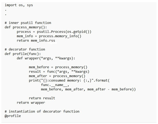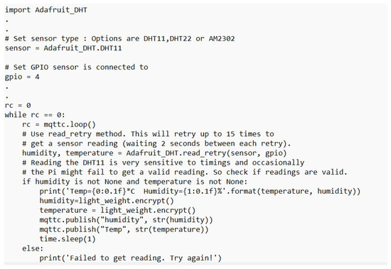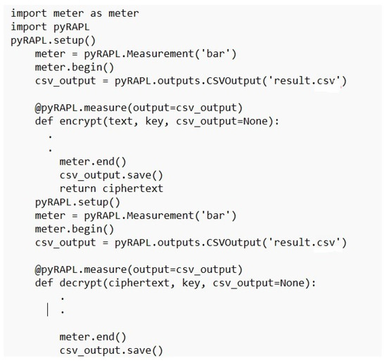 Table 3 presents the simulation packages used in the performance evaluation of the X-cipher. A Windows 10 virtual machine runs the Raspberry Pi emulator that was selected. An Ubuntu 20.1 virtual machine is used for the subscriber. The DHT-11 sensors are connected directly to the Raspberry Pi Emulator. Figure 4 illustrates selected parts of the Python code used to obtain humidity and temperature reading from DHTT-11 sensors. The Adafruit_DHT Python library is available for reading the DHT series of humidity and temperature sensors on a Raspberry Pi. First, the sensor type and the pin that the DHT-11 is connected through to Raspberry Pi must be specified. Then, the function Adafruit_DHT.read_retry is used to read from the specified pin. As can be noticed, the humidity and temperature readings are encrypted using the lightweight class function encrypt, which is our class implementation for the X-cipher protocol. Moreover, Figure 5 depicts a selected part of the MQTT client code for the Raspberry Pi emulator. The paho.mqtt.client Python library is deployed to provide a client class with support for MQTT protocol, and it also provides some helper functions that facilitate publishing messages to an MQTT server. Figure 6 highlights selected parts of the python code used to calculate memory usage. Calculations of memory usage rely on the process.memory_info and choosing the “rss” option returns the actual physical memory the process is using. Figure 7 illustrated selected parts of the Python code used to calculate power consumption. The pyRAPL Python library is utilized to measure the energy footprint of a host machine along with the execution of a piece of Python code. Three performance metrics were used to evaluate and compare the Expeditious Cipher (X-cipher) and the AES cipher [32]: power consumption, execution time, and memory usage for a file of 10,000 message comma separated of total size 20 MB.