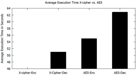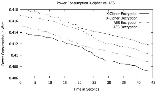 Figure 8 compares the two algorithms’ power consumption during the encryption and decryption process. As shown in the graph, X-cipher requires less power consumption than AES throughout the whole encryption and decryption process. This makes X-cipher more convenient for IoT devices with limited energy resources. This is due to the dependency of X-cipher on just the XOR function between the generated hashed sub-key and the plain text, whereas AES depends on substitution–permutation operations. Moreover, the number of rounds in X-cipher is just eight, whereas the number of rounds is ten in the case of AES.