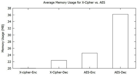 Figure 9 compares the memory usage during the encryption and decryption process for the two algorithms. As shown in the graph, X-cipher requires less memory than AES throughout the whole encryption and decryption process. X-cipher has average memory usages of 20.04 MB and 22.38 MB during the encryption and decryption processes, respectively, in contrast to AES, which has average memory usages of 24.56 MB and 36.2 MB during the encryption and decryption processes, respectively. The higher memory usage in the case of AES is due to the substitution–permutation principle employed in AES. This implies that X-cipher is more suitable for IoT devices with constrained memory capacity.