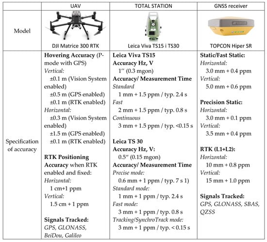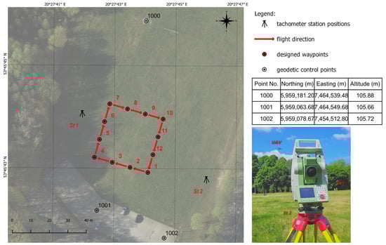 Geodetic coordinates in the reference frame were determined with the static GNSS method during two measurement sessions lasting 45 min each with 4 TOPCON Hiper SR GNSS receivers (Figure 3). Coordinates were mapped in the PL 2000 National Two-Dimensional Coordinate Reference System. The measurements were linked with the ASG-EUPOS network of permanent reference stations, from which the nearest (ID: OPNT) was located at a distance of 3.7 km from the site of the survey. At the same time, 4 points of the basic altimetric network located in the nearest vicinity, whose distances from the place of flight ranged from 0.8 km to 2.49 km, were used in the measurements to establish the newly measured points. Coordinates calculated from the grid alignment were mapped with a horizontal accuracy of 0.002 m and a vertical accuracy of 0.005 m. The location of tachometer stations using the Free Station method is based on highly accurate coordinate measurements. The drone’s position was verified with the use of Leica Viva TS30 and Leica Viva TS15 robotic tachometers (Figure 3).