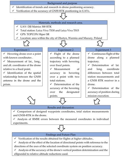 Currently, it should be noted that in commercial applications, especially for the low-budget UAV segment, GNSS-RTK technology is the optimal choice. The authors, considering the above-mentioned problems in used method and the accuracy parameters specified in the specification of the model, decided to verify the precision of the drone’s positioning through the experiments undertaken. Therefore, the main aim of the research was to verify the stability and accuracy of positioning using the GNSS-RTK method.