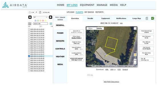 The experiments generated sets of independent coordinate measurements. The first dataset contained information about the UAV’s coordinates based on the data logged by a dedicated web application for DJI solutions. The AIRDATA application registers flight parameters, weather conditions, battery levels, and displays alerts about equipment and environmental factors that could impact flight performance (Figure 6). Coordinates were registered in the decimal system (WGS 84), and they had to be converted to the PL 2000 reference format for comparison with tachometer data. The UAV registered its position ten times per 1 s. The second dataset comprised tachometer measurements.