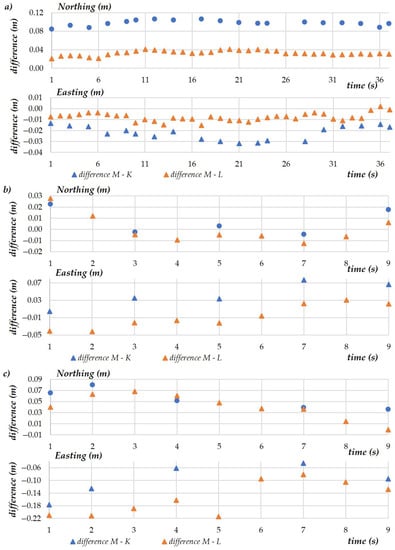 A comparison of the coordinates measured at each examined altitude revealed that the measurements conducted at H = 1.5 m should be additionally verified. For this purpose, 20 additional tachometer measurements (K) were conducted over a period of 36 s. To facilitate data comparison, the coordinates registered by the UAV (10 measurements per second) were averaged for a 1-s interval. The determined values were then compared with the model values used in the UAV mission (M).