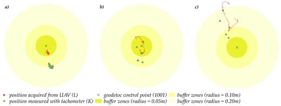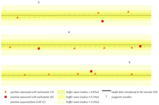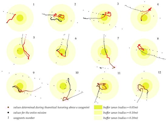 The UAV’s flight trajectory relative to ground control points is presented in Figure 11. The values for the entire mission are marked in black, and the values determined during theoretical hovering above a waypoint are market in red. Buffer zones with radii of 0.05 m, 0.10 m and 0.20 m, describing the distance between the UAV’s position and the planned waypoints, are also presented in the diagram. Differences in the centering accuracy, which is independent of the direction of flight and changes in direction, can be also observed relative to all waypoints.