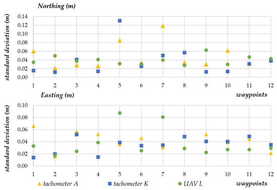 The scatterplots presenting the standard deviation for every measuring device revealed low data spread. On the X-axis, the standard deviation of the measured values ranged from 0.01 m to 0.04 m for most points. Standard deviation values were two or three times higher only in sporadic cases (Figure 10). The measurements of the Y-coordinate were more stable, and standard deviation ranged from 0.01 m to 0.07 m for all waypoints.