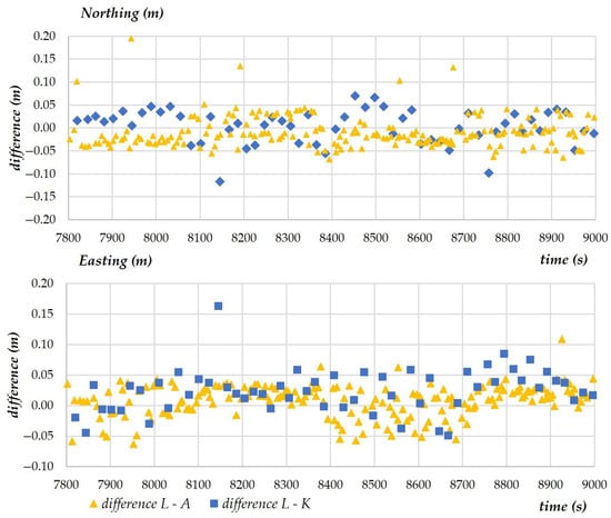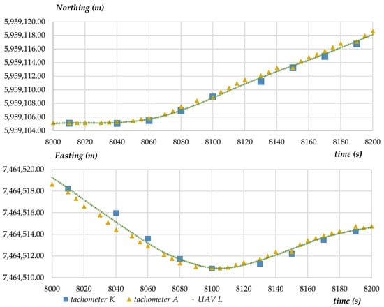 Based on the results of the second experiment, which compared the modeled values with tachometric measurements and GNSS RTK measurements during the flight, in the next stage of the study, an attempt was made to compare the differences between UAV coordinates and terrestrial measurements. During photogrammetric measurements conducted for surveying purposes, images are captured by drone cameras, and the obtained results and their evaluation have the most important practical implications. The results of the comparison, including the values of X- and Y-coordinates, are presented in the below diagram (Figure 13). The diagram shows variations in the differences between the coordinates measured by the UAV and registered in the AIRDATA application (L) and the coordinates measured by tachometers (A) and (K). Data are registered continuously in the AIRDATA application, and the time marking the beginning of the mission was set at 7800. The third experiment lasted 120 s due to the size of the study area. The difference in the values of coordinates determined by both tachometers relative to the UAV’s position approximated 0.05 m for both X- and Y-coordinates.