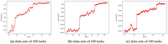 Figure 4 shows the change of the total reward of the Actor–Critic algorithm on 100, 500, and 1000 test tasks set, respectively. As can be seen from the figure, the total reward of the model obtained at the initial stage of training is low on the task set, which indicates that the model needs to be trained a certain number of times to obtain a better resource allocation scheme. In addition, it can be found that the convergence rate of the algorithm on the different number of tasks is not the same. In general, the more tasks the algorithm converges, the slower the algorithm converges. When the number of training iterations reaches 40, 50, and 70, the total reward of the algorithm on 100, 500, and 1000 test tasks set gradually becomes stable.