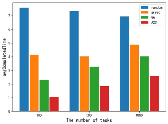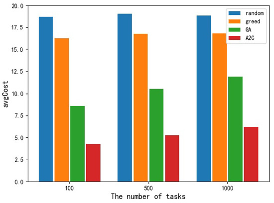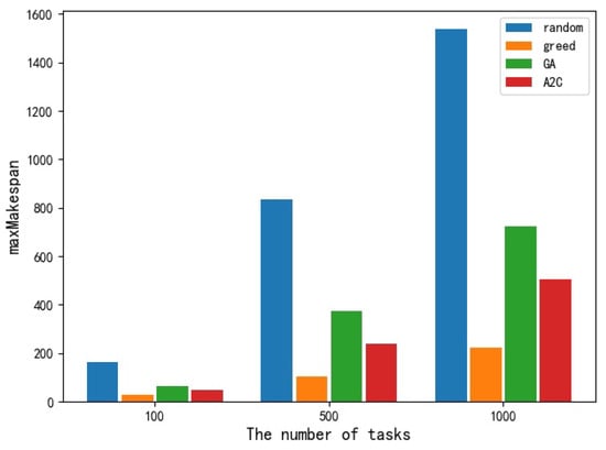 As for the performance of the index, it can be seen from the table that the maximum completion time of the system obtained by using a random scheduling algorithm on 100, 500, and 1000 task sets is the largest among the four scheduling algorithms and is proportional to the number of tasks. The GA algorithm and A2C algorithm come second, and the greedy strategy has the least. This trend also increases with the number of tasks, and the gap between different algorithms becomes more and more obvious. Figure 5 shows the histogram of different scheduling algorithms on , which can intuitively show the advantages and disadvantages of different algorithms on .