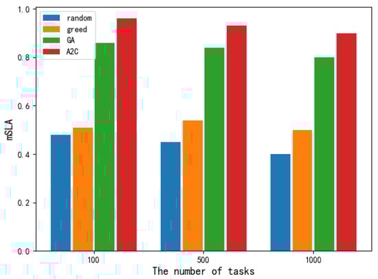 As for the index, it can be seen that the random selecting scheduling algorithm on the test set can only ensure that less than 50% of the tasks meet the requirements of service quality. The greedy algorithm and random selection algorithm are not much different. The GA algorithm can ensure that about 80% of the tasks meet the quality of service requirements. The A2C algorithm can ensure that more than 90% of the tasks can meet the requirements under different task numbers, but the proportion decreases with the increase of tasks. Figure 8 shows the histogram of the performance of different resource-scheduling algorithms on .