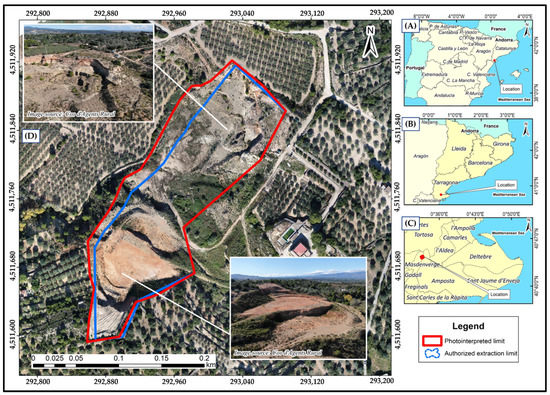 The study area is located in the region of Montsià, municipality of Masdenverge, province of Tarragona—Catalonia (Northeast of Spain) (Figure 1A,B). The extractive activity called Belén EA20040002 is located at the geographic coordinates Latitude 40°43′49″ N and Longitude 0°32′54″ E, between 53 and 87 m.a.s.l. The company Construcciones y Ayudas Ferroviarias, S.L. dedicated to the extraction of gravel is operating it [21].