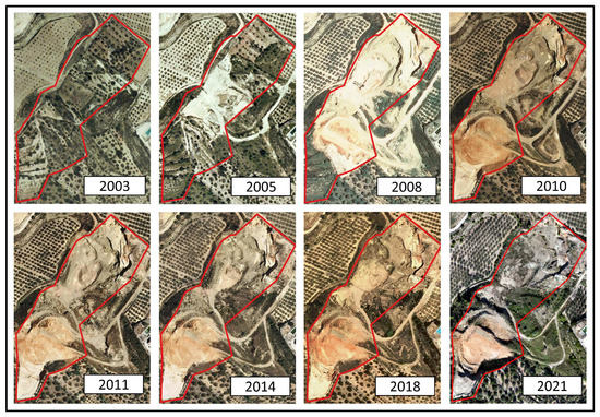 At the geological level, the substrate is generally composed of sedimentary material and rocks (grayish limestones, gray, black and red shales, and blackish peats) [22]. According to the visual analysis of the time series 2000–2021 orthophotos [23], it can be inferred that the exploitation activities began between 2003 and 2004 because in previous years no outstanding change of earthwork in the study area was visualized. In contrast, 2005 images show very characteristic bright tones of bare ground and the establishment of access for heavy vehicles. From that point on, the extraction of material modified the natural environment, mainly the topography and the vegetation cover, initially in the central and northern sectors. In 2010, the entire authorized area was already exploited and during 2011, the extraction operations at the central and northern sectors finished, resulting in the growth of small bushes and grasslands. In 2021, the whole area was already undergoing a process of abandonment, pending the start of restoration actions (Figure 2).