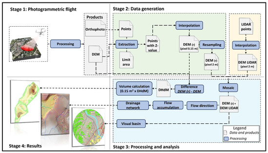 Methodology workflow, from Stage 1 (photogrammetric flight), Stage 2 (Data generation), Stage 3 (Processing and analysis), and Stage 4 (digital mapping results).