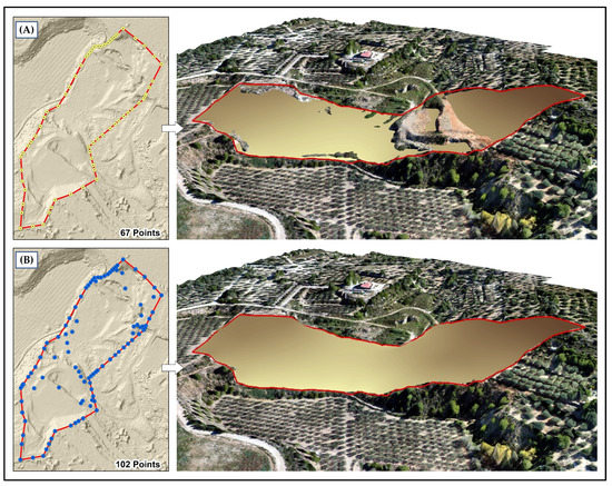 The DEM of the restored relief (DEM(r)) obtained as a first result is a model that simulates the filling surface required. However, the authors advise that it can present some imperfections (Figure 4A) because only altitude values corresponding to the contour of the gravel pit were initially chosen, without considering higher altitude values within the area. The lack of references inside the area can generate a filling model presenting protrusions corresponding to the higher altitude values. In order to improve the final relief and the restoration model of the morphology of the land, the method includes new points that have been added at the maximum height locations within the gravel pit (in this study case 35 new points) based on the higher peak values of the actual drone derived DEM-DRONE (Figure 4).