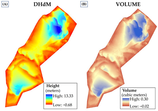 where V is the volume, a is the pixel resolution (15 cm or 255 cm2) and h is the Digital Height Difference Model (DHdM) [31], obtained from the difference between DEM(r) and DEM-DRONE.