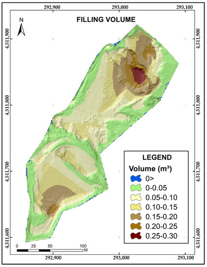 The operation was performed on a raster calculator that operates at the pixel level, resulting in a new spatially detailed map informing about the height attribute (h) required to reach the fill level at each cell. This attribute is then transformed to the volume of filling (m3) required per pixel to restore the morphology of the terrain by multiplying each pixel attribute by its own area (in this study case, at 15 cm × 15 cm the pixel area is 0.0255 m2) (Figure 5 and Figure S1). A total volume of filling is obtained by adding up the values of each pixel.