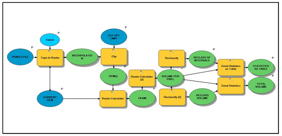 Volume calculation workflow diagram in ArcMap 10.7. The reader can find the tool in the Supplementary Materials (Volumetric_Tool.zip).