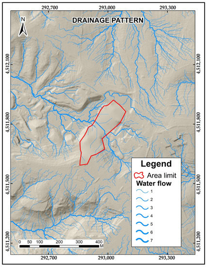 The direction of the decline of each cell is calculated through the altitude values of DEM(i), taking as a reference the method of D8 [32], which considers that a cell has the option of the direction of its 8 closest neighbors, choosing the one with the lowest value. According to the number of times a cell converges towards another, a weight value is assigned, and the cells with the highest number of flow accumulation (higher weight) are classified as channels of the water flow network. At the scale of this study case, cells with an accumulated flow weight value > 50 were considered water stream channels; cells with values < 50 were assigned null values; cells of weight 0 identified the ridges (see Figure S2 in Supplementary Materials).
