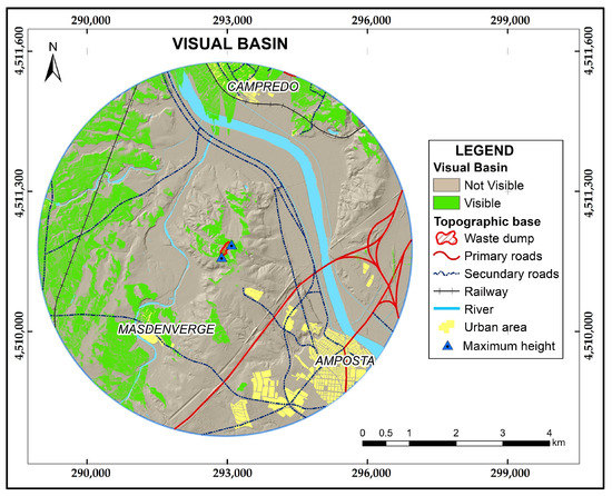 In order to analyze the landscape impact generated by the restored relief of an extractive activity, it is important to evaluate the visual scope that is perceived from different observation points. The calculation of the visual basin was based on DEM(i). Points of maximum height levels within the limit of the gravel pit were classified as observation points, taking a buffer of 4 km and considering elements such as roads and urban centers. ArcMap 10.7 visibility tool was used to calculate the visual basin [33], which determines the raster surface locations visible to a set of observer features or identifies which observer points are visible from each raster surface location. The result is a binary map assigning values 1 to visible cells and values 0 to non-visible cells.