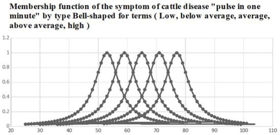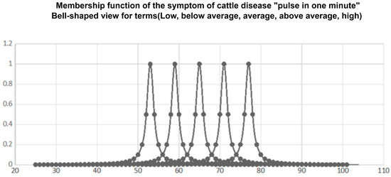The membership function is determined by the above formula; it is from 50 to 65 times per minute, from 65 to 80 times per minute, and 0 for up to 50 times per minute and more than 80 times per minute. An increase in the pulse per minute in cattle is the diagnosis of secondary osteodystrophy.