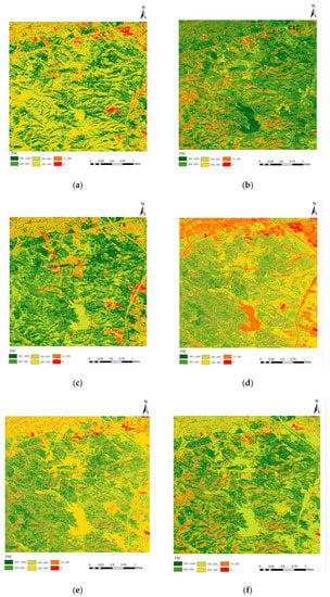 According to the CIVE vegetation coverage extraction model, the results of the multi-stage vegetation coverage map were obtained according to the six-level classification criteria of 0, 1–20%, 20–40%, 40–60%, 60–80%, and 80–100%, as shown in Figure 6.