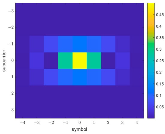 Obviously, the strict observance of these conditions for physically realizable filters is impossible; therefore, the scientific community has performed work on the synthesis of quasi-optimal prototype filter designs that are close to the conditions of perfect reconstruction. These prototypes differ mainly in the properties of the frequency (determining the level of distortion) and time localization. As part of a comparative analysis carried out by the PHYDYAS research project, the filter presented in the work by Bellanger [18] and later called the PHYDYAS prototype filter was adopted for use. This filter provides good localization in the frequency domain and low distortion at a relatively short IR length (numerically equal to the number of channels times 4), which can be seen in the discrete ambiguity function of this prototype filter presented in Figure 1, defined as: