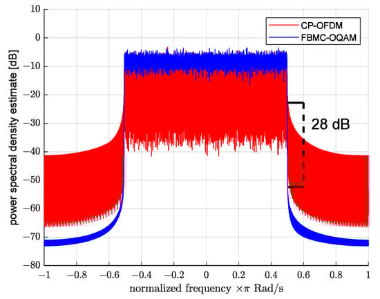 Thanks to the filtration of subcarrier signals, the FBMC-OQAM group signal has significantly better power spectral density (PSD) localization compared to CP-OFDM. To clearly demonstrate this difference, two signals were generated using each of the technologies, where half of the subcarriers located in the center of the main frequency range contained random data symbols (the same for both signals), and the symbols of the remaining subcarriers were equal to zero. The total number of subcarriers was set to 512. The power spectral densities of these signals are presented in Figure 2, which shows that for two subcarriers offset from useful signal frequencies, FBMC-OQAM provides a 28 dB lower out-of-band signal level compared to CP-OFDM.