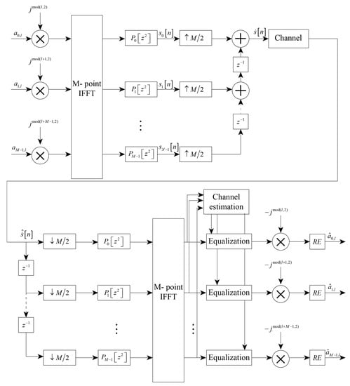 where denotes transmitted PAM symbols, which are obtained by extracting the real and imaginary parts from QAM symbols, is a discrete shift in the time domain by half the length of the baseband symbol, is the filter prototype IR length, is the phase shift for the -th subcarrier and -th symbol, and is the number of subcarriers.